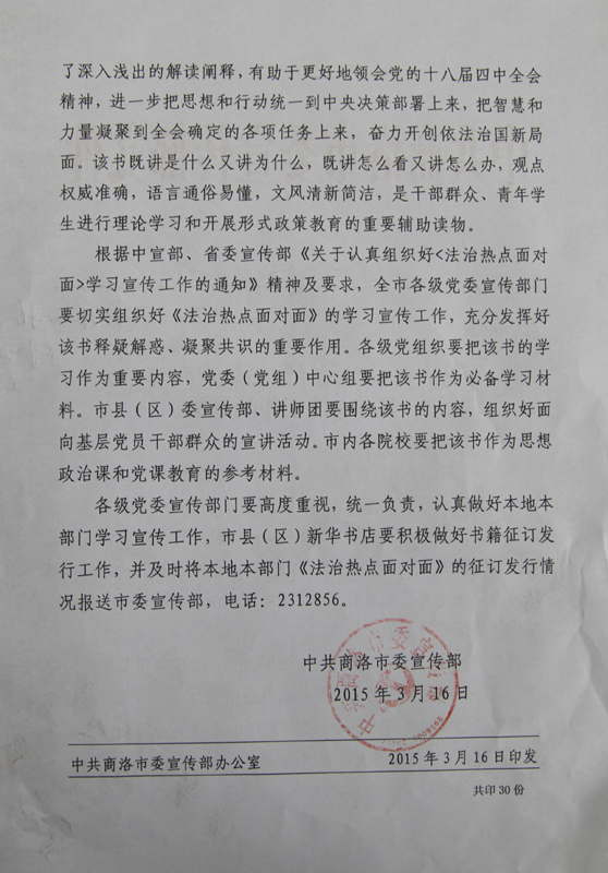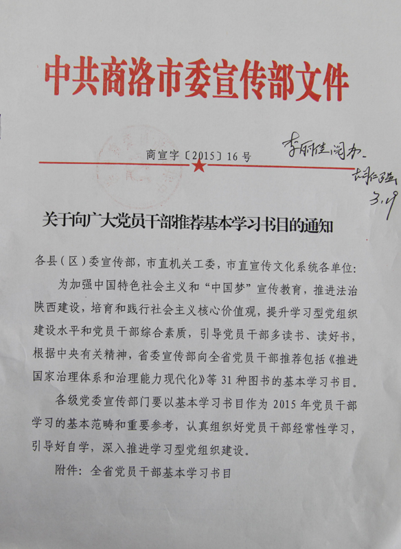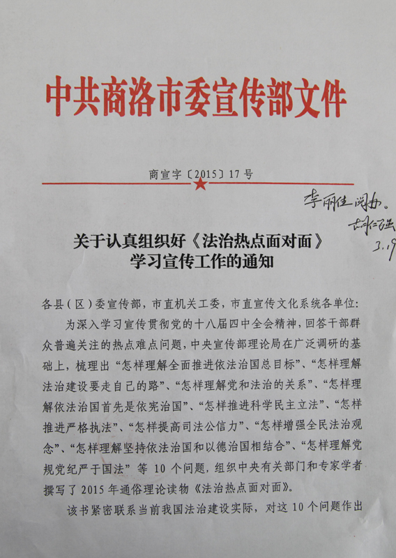 现将市委宣传部《关于向广大党员干部推荐基本学习书目的通知》(商宣字[2015]16号)、《关于认真组织好<法治热点面对面>学习宣传工作的通知》(商宣字[2015]17号)文件转发给你们,请按照要求做好相关书籍的征订和学习工作。